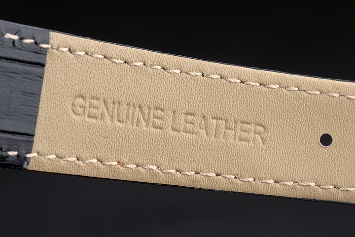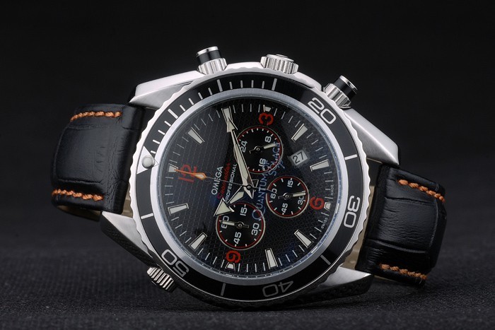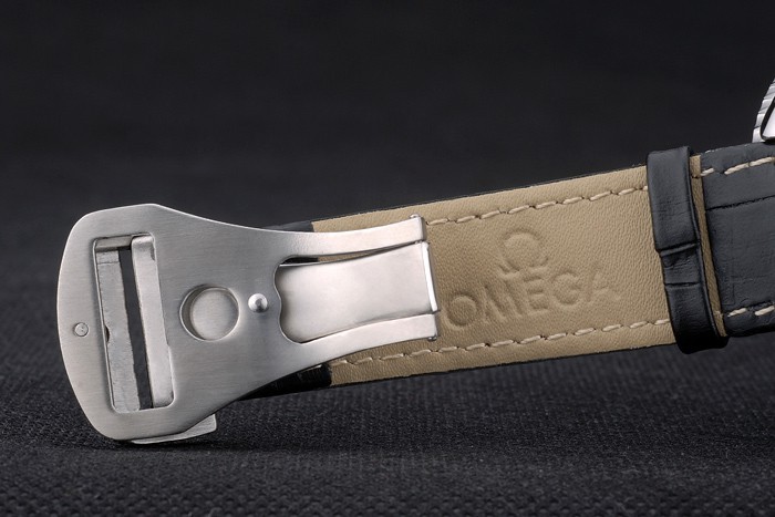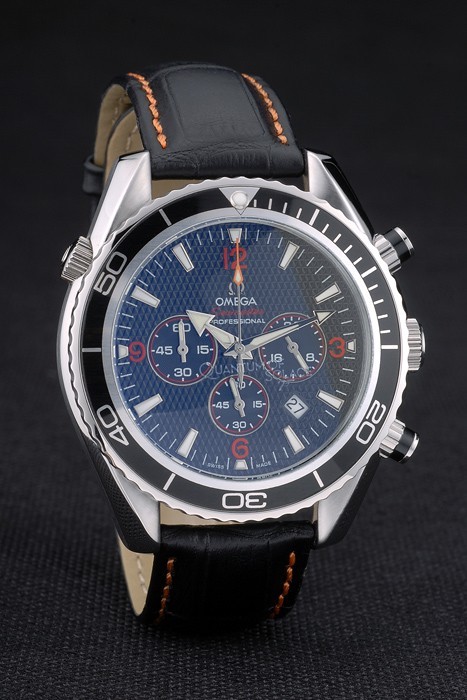 Armband: Orange genäht schwarzes Lederarmband mit Hitze geprägt Omega Stempel und poliertem Edelstahl Einfalt- Verschluss mit Omega-logo auf top