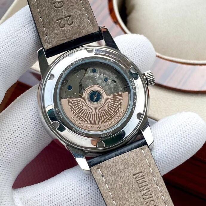 Zurück: Poliert Edelstahl verschraubt Rücken mit transparenten Mechanik Zentrum und Vacheron Constantin engravings
